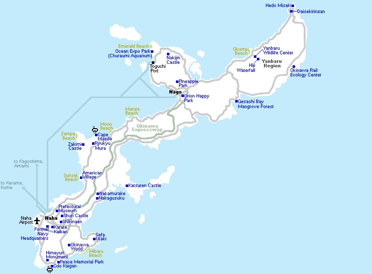 - با خودرو شخصی: مسیر از طریق بزرگراه اوکیناوا حدود دو ساعت طول میکشد و چشمانداز فوقالعادهای از جزیره دارد.